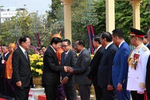 ពិធីបដិសណ្ឋារកិច្ចស្វាគមន៍ ឯកឧត្តម ថងលុន ស៊ីសុលីត(Thongloun Sisoulith) ត្រូវបានធ្វើឡើងនៅព្រះបរមរាជវាំងដោយមានទទួលដោយកងកិត្តិយសត្រែទ័ព ជាមួយការគោរពភ្លេងជាតិ នៃសាធារណរដ្ឋប្រជាធិបតេយ្យប្រជាមានឡាវ និងភ្លេងជាតិនៃព្រះរាជាណាចក្រកម្ពុជា ទៅតាមលំនាំនៃការទទួលបដិសណ្ឋារកិច្ចផ្លូវរដ្ឋជូនថ្នាក់ដឹកនាំនានា ដែលអញ្ជើញមកបំពេញទស្សនកិច្ចផ្លូវរដ្ឋនៅកម្ពុជា។